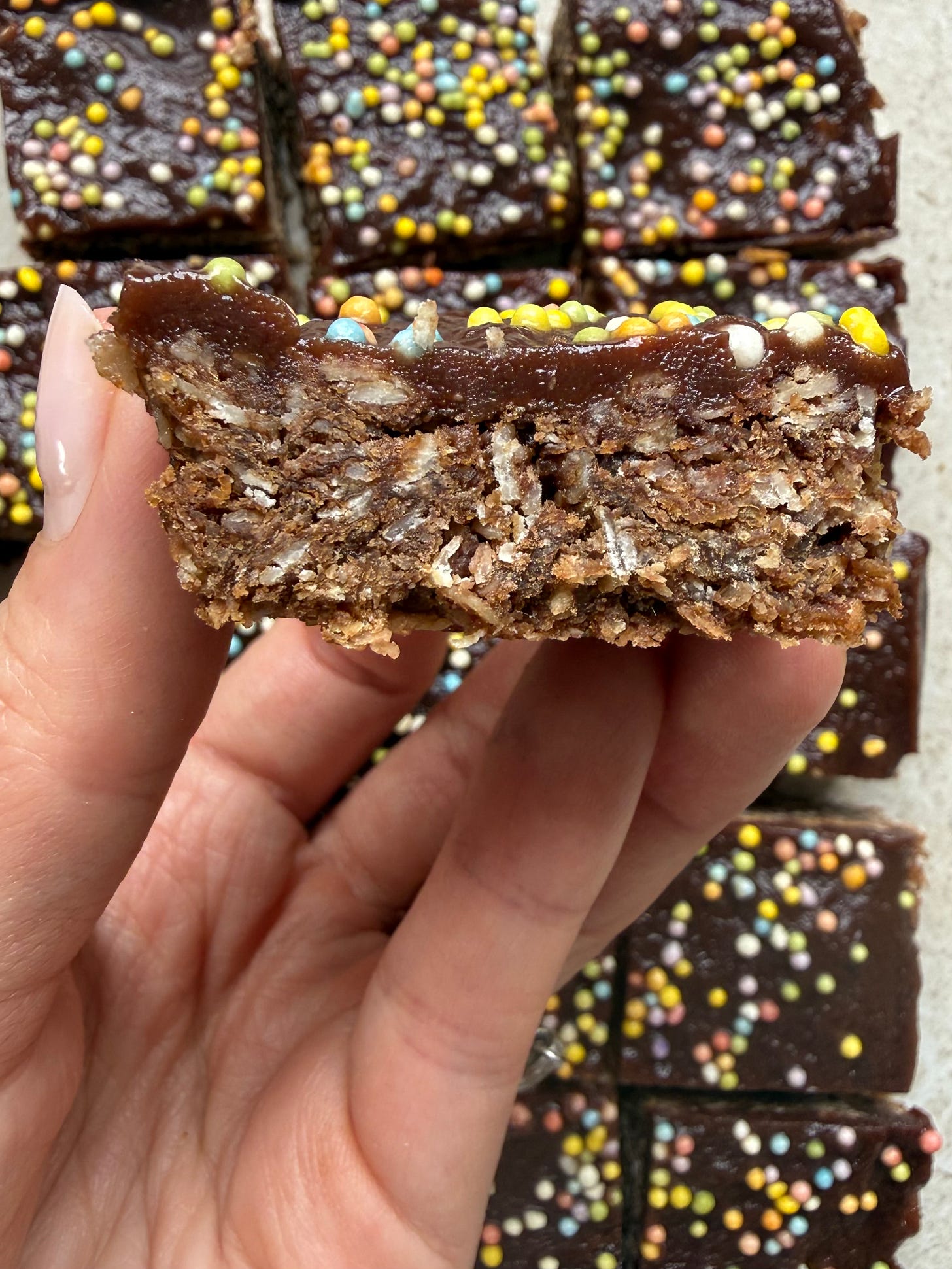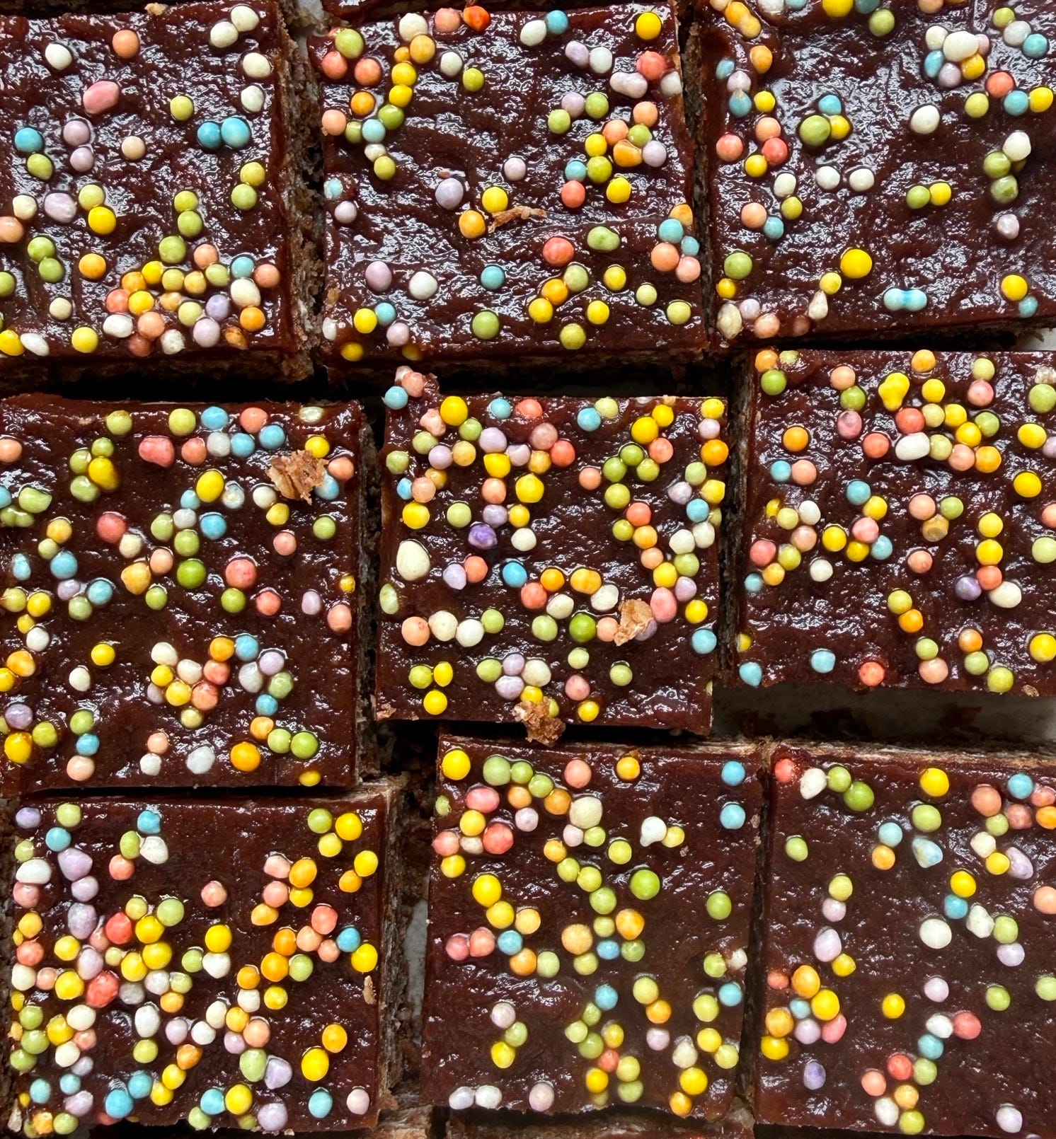 There are some recipes that just work and you come back to again and again - and I have a feeling this might be one of those recipes. It’s the kind of slice that you can make with pantry staples and you can’t really go wrong with. This recipe was actually inspired by one of my OG slice recipes, however this one is more like the nostalgic Weet-Bix slice many of us grew up with - just a little more nourishing. It’s perfect for kids parties, after school snacks and even lunchboxes. I love how this version feels a little bit special - the icing is indulgent, the base is chewy and who doesn’t love some sprinkles to really seal to deal. Another one bowl wonder, that will be perfect for Easter too - you could even pop a few little eggs on top!